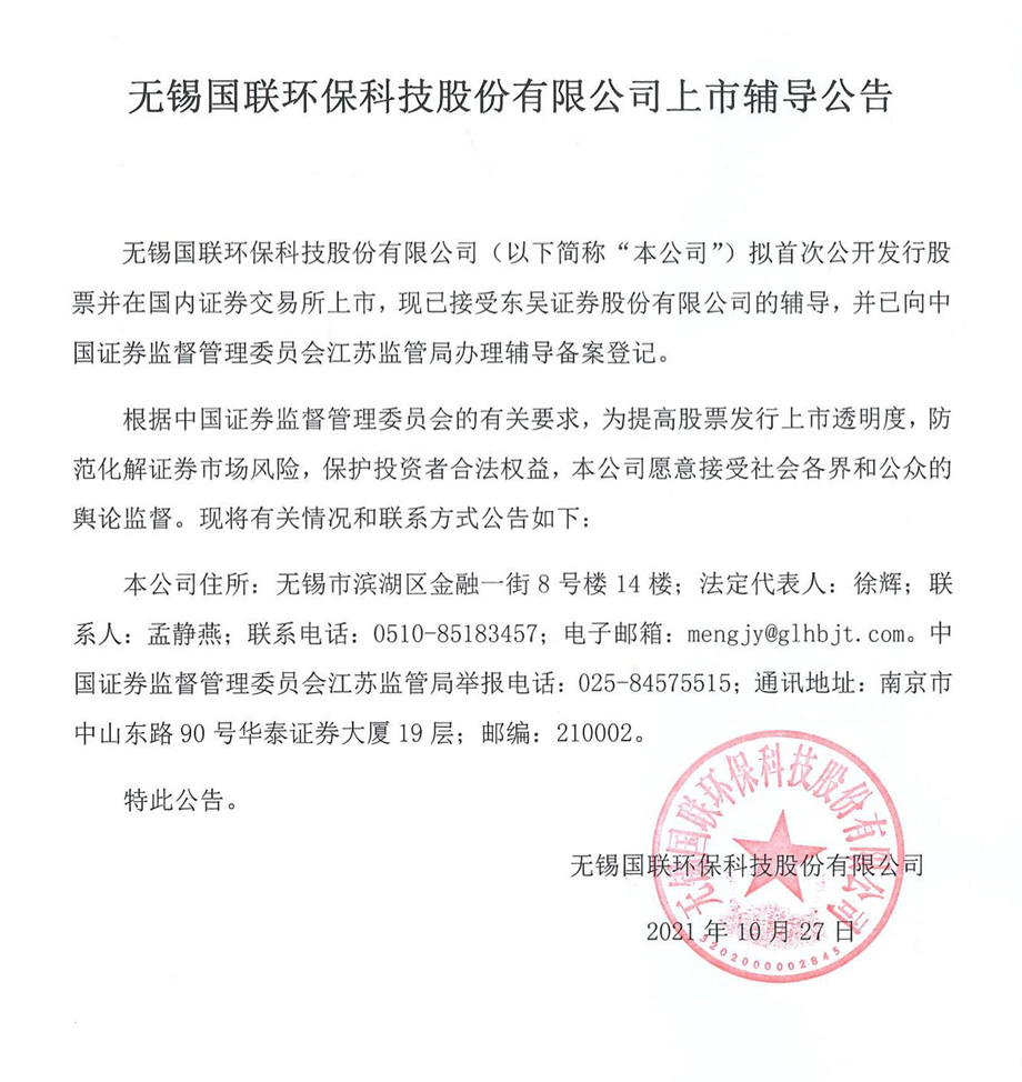 無錫國聯環??萍脊煞萦邢薰境闪⒂?011年1月27日,是一家以污泥減量化、無害化、資源化處置為產業化發展的國有控股企業,股本為109,470,852元。